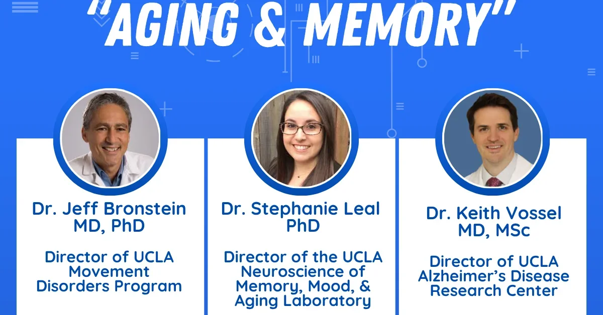 The evening will feature 3 guest speakers: Dr. Jeff Bronstein (Director of UCLA Movement Disorders Program), Dr. Stephanie Leal (Director of UCLA Neuroscience of Memory, Mood, and Aging Lab), and Dr. Keith Vossel (Director of UCLA Alzheimer’s Research Center).